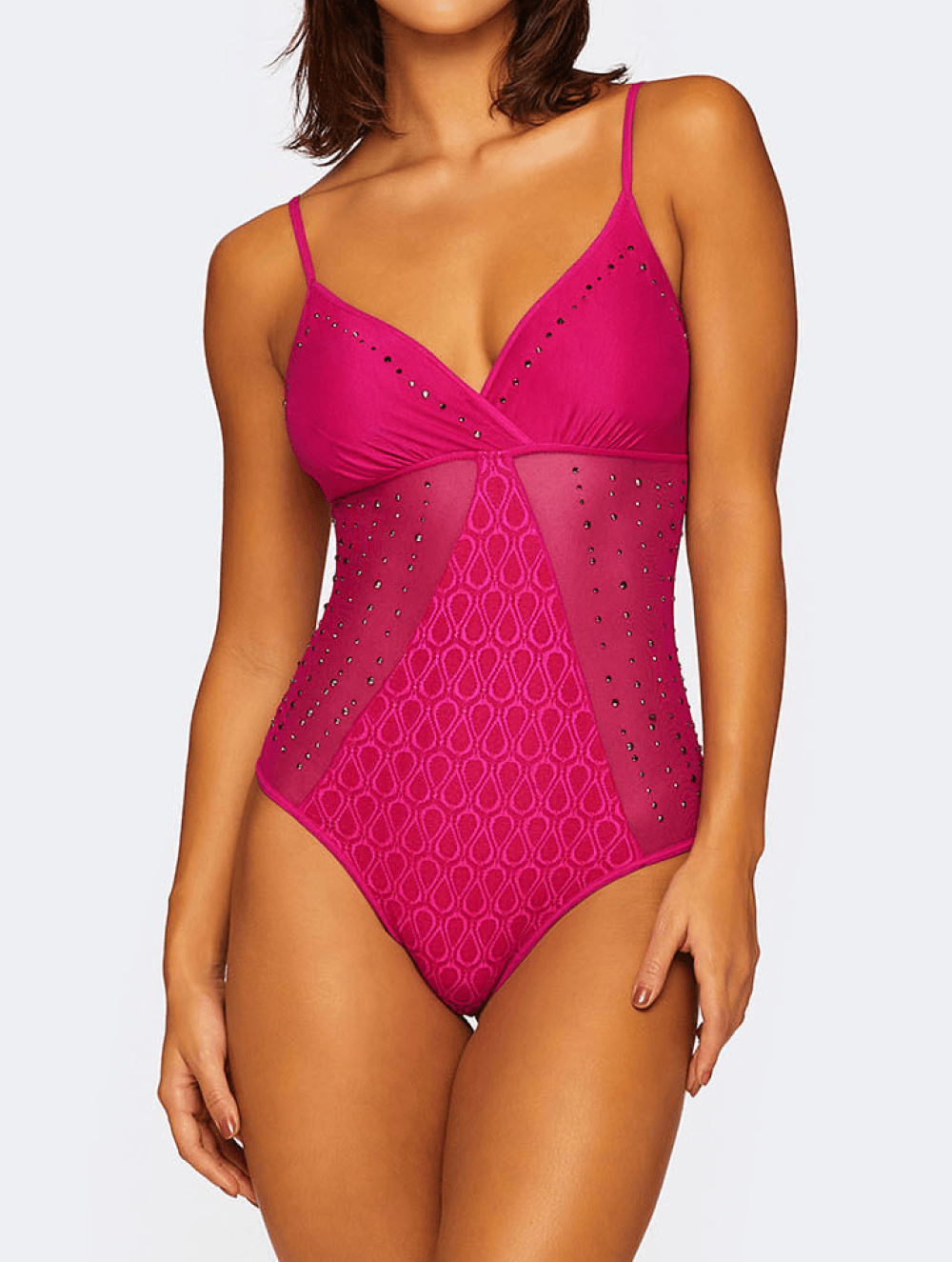 Body confeccionado em tule. Possui recortes frontal e traseiro em laise, alças ajustáveis, laterais em tule com detalhes em aplicações de cristais, fecho traseiro em imã e forro em microfibra.