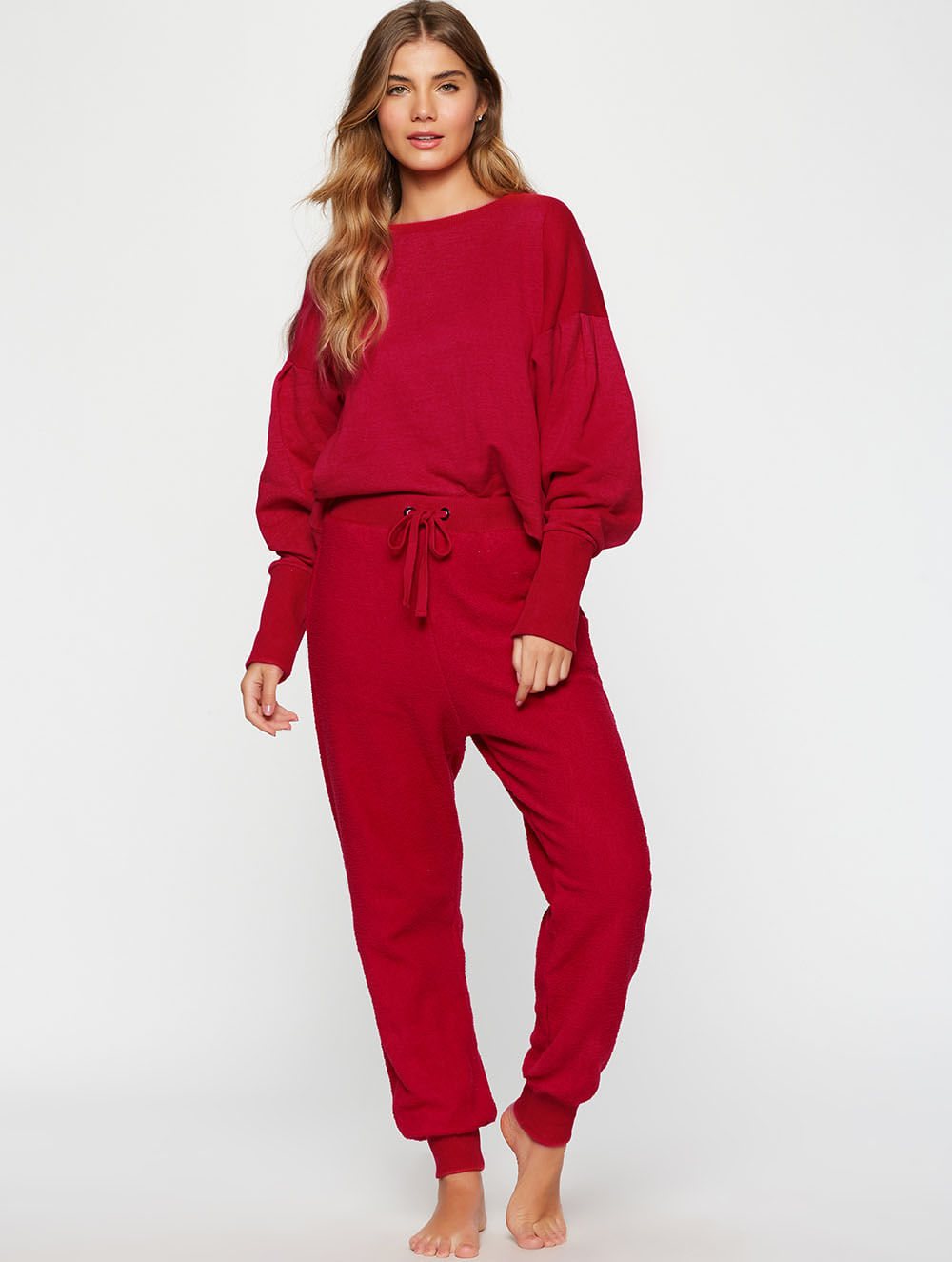 Calça com modelagem jogger desenvolvida no avesso do tecido, criando uma textura para a peça. Elástico no cós com amarração e punhos nas barras em tecido canelado.
