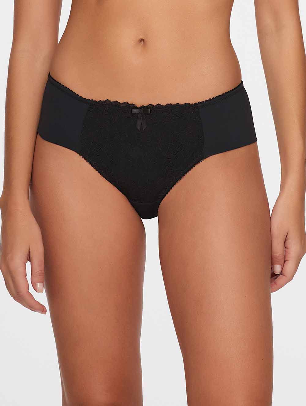 Calcinha cavada com laterais em tecido duplo e detalhes em renda na frente.