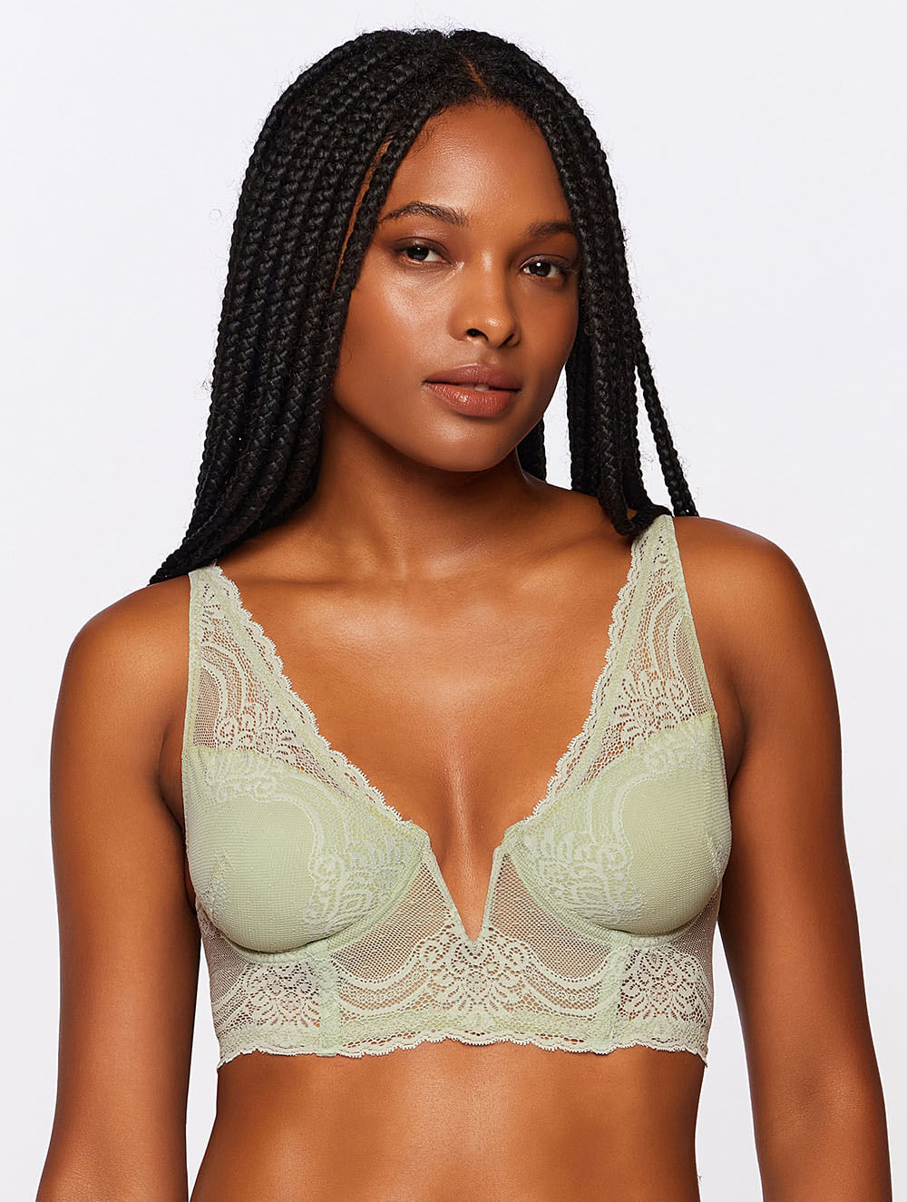 Corpete sem bojo e com aro, todo em renda, com busto forrado em microfibra. Possui detalhe em V no meio do busto, alças mais largas com regulagem e fecho nas costas.