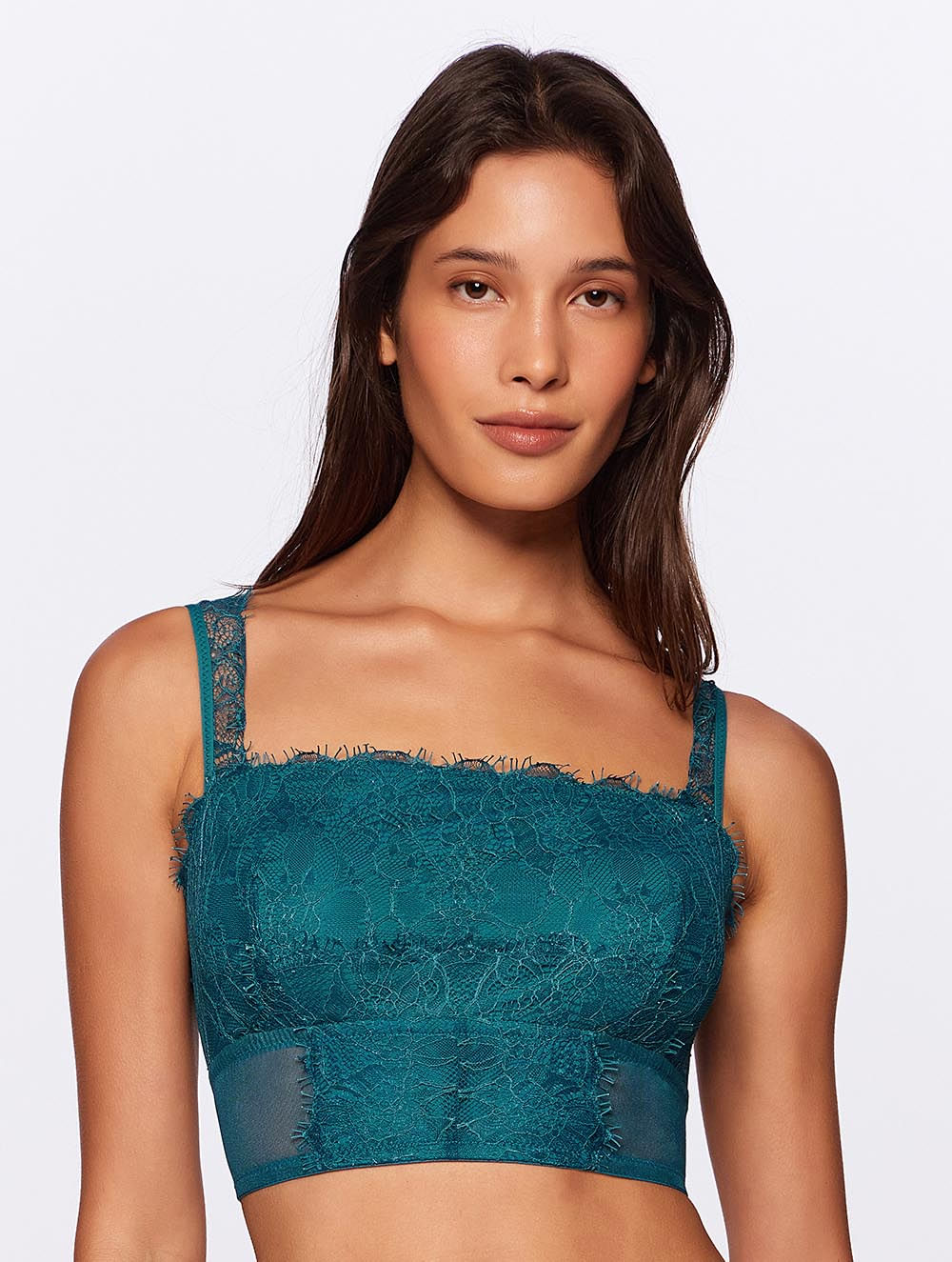 Corpete em renda e tule, com busto forrado, decote reto e detalhe de renda nas alças. Possui alças com regulagem e fecho nas costas.