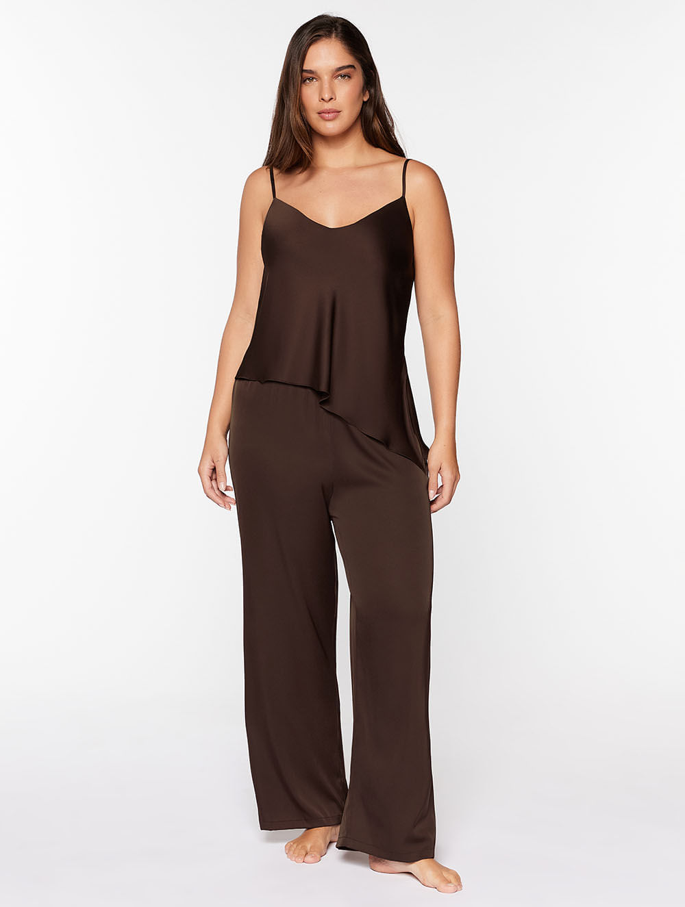 Pijama confeccionado em cetim composto por blusa de alças finas com regulagem e barra assimétrica e fenda na lateral. A calça tem cós fino com canaleta e rolotê para ajuste na cintura.