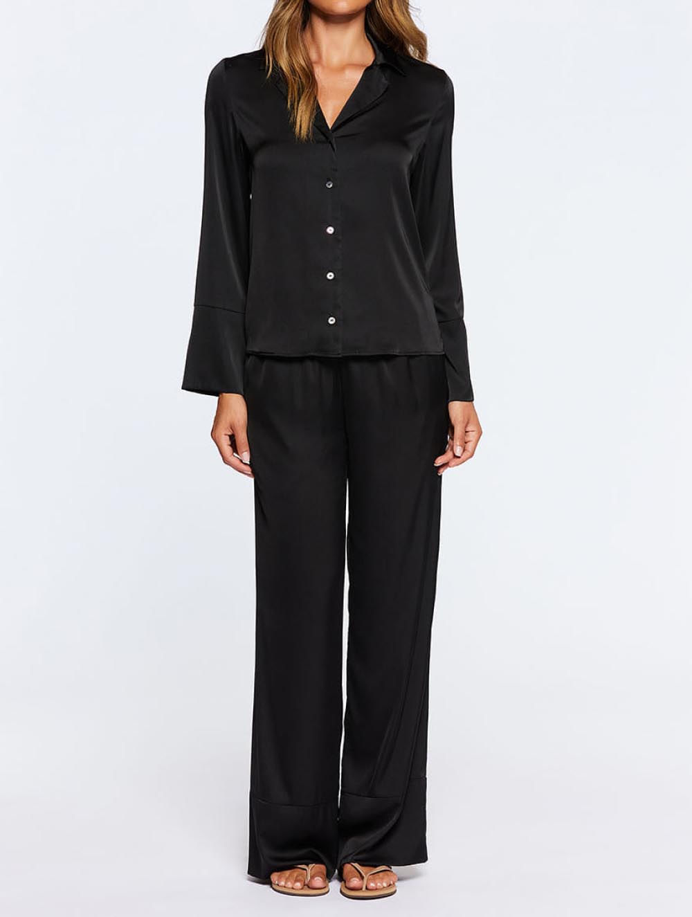 Pijama confeccionado em cetim, com camisa manga longa com punhos