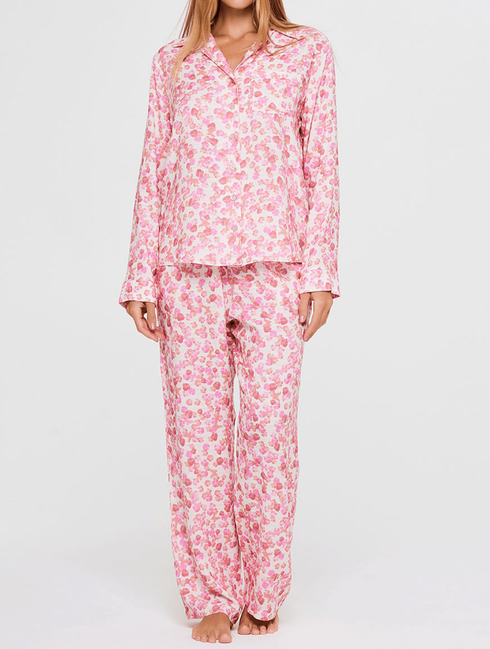 Pijama em viscose maquinetada estamapada. o modelo possui blusa amanga longa com botões para fechamente e calça.