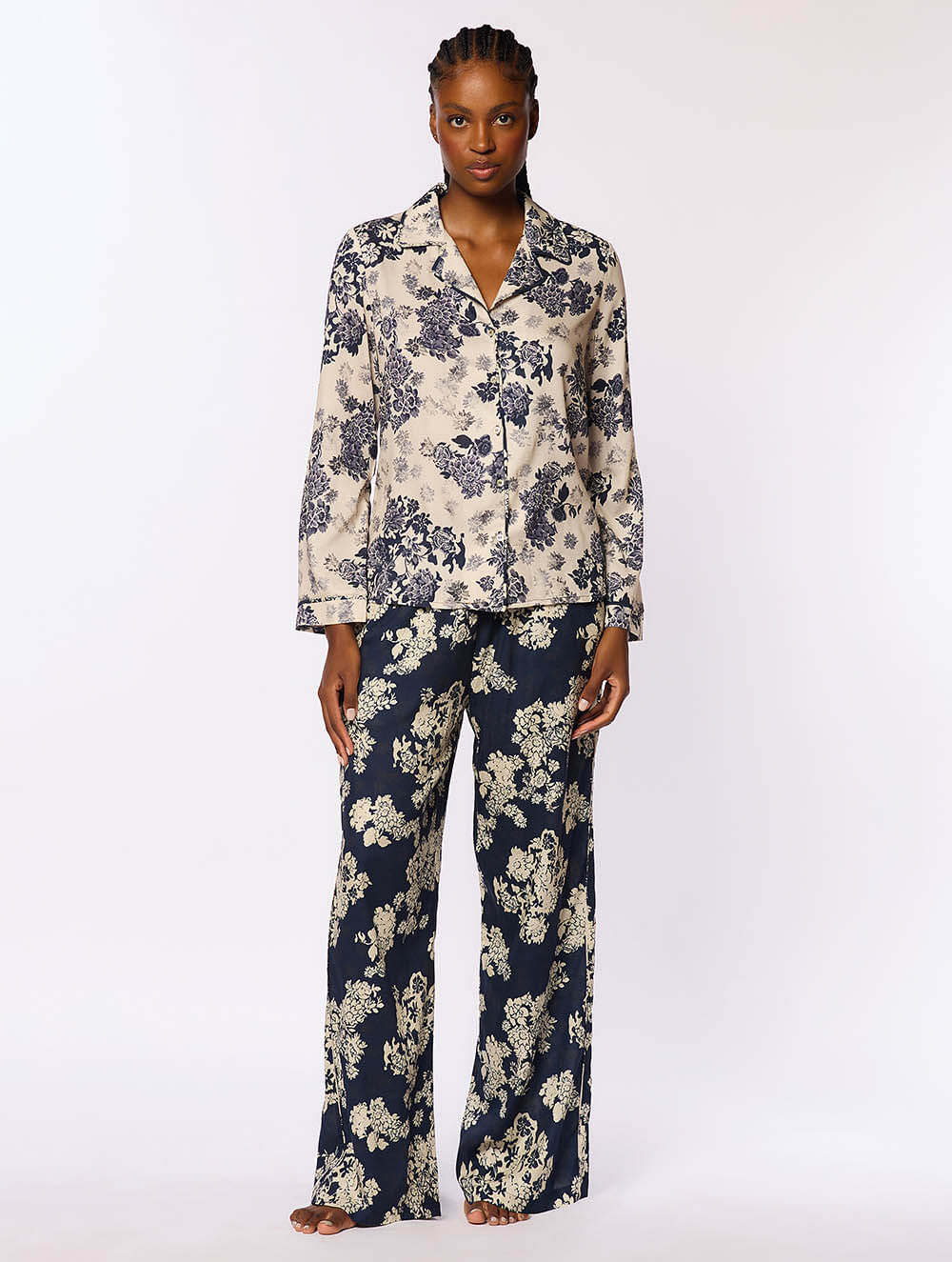Pijama confeccionado em viscose que proporciona conforto e suavidade. Possui gola, mangas longas, vista com botões madrepérola e sofisticados detalhes em vivos de cor contrastante. Calça confeccionada em viscose que proporciona conforto e suavidade. Calça possui bolsos, cós com elástico embutido, modelagem soltinha e sofisticados detalhes em vivos de cor contrastante. A estampa floral acrescenta um toque de elegância e charme.