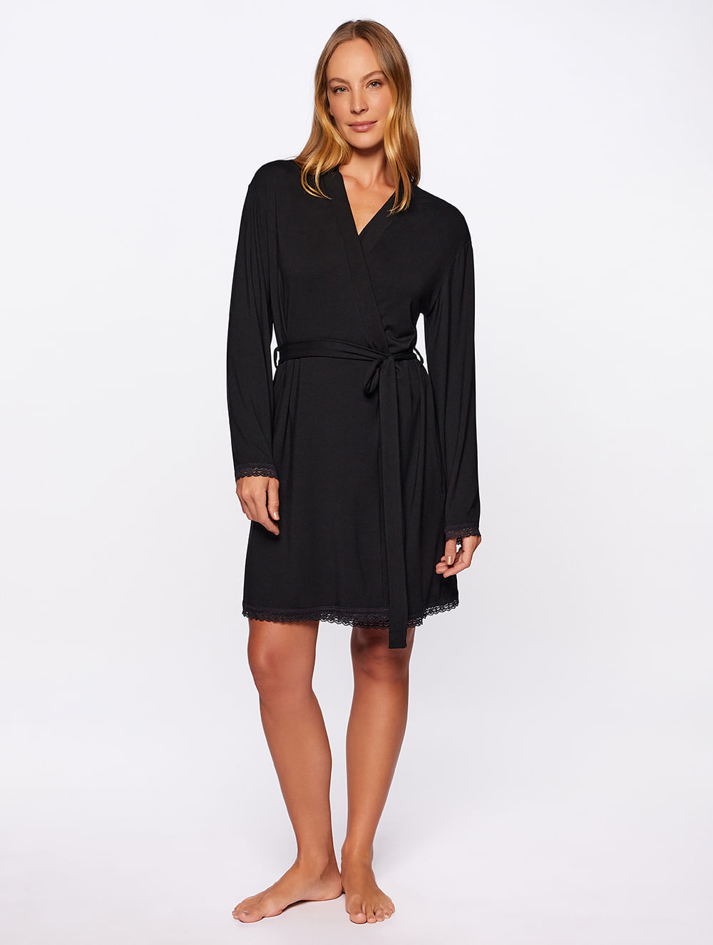 Robe curto, confeccionado em modal, com mangas longas e renda aplicada nos punhos e na barra. Possui faixa com passantes para amarração na cintura.
