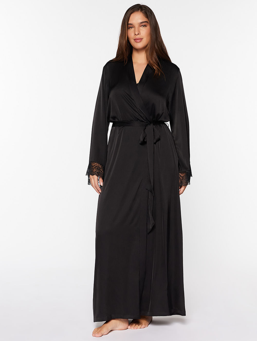 Robe confeccionado em cetim com sofisticado comprimento longo, manga longa, aplicação em renda na barra da manga, que oferecem um charme, e faixa solta para amarração.
