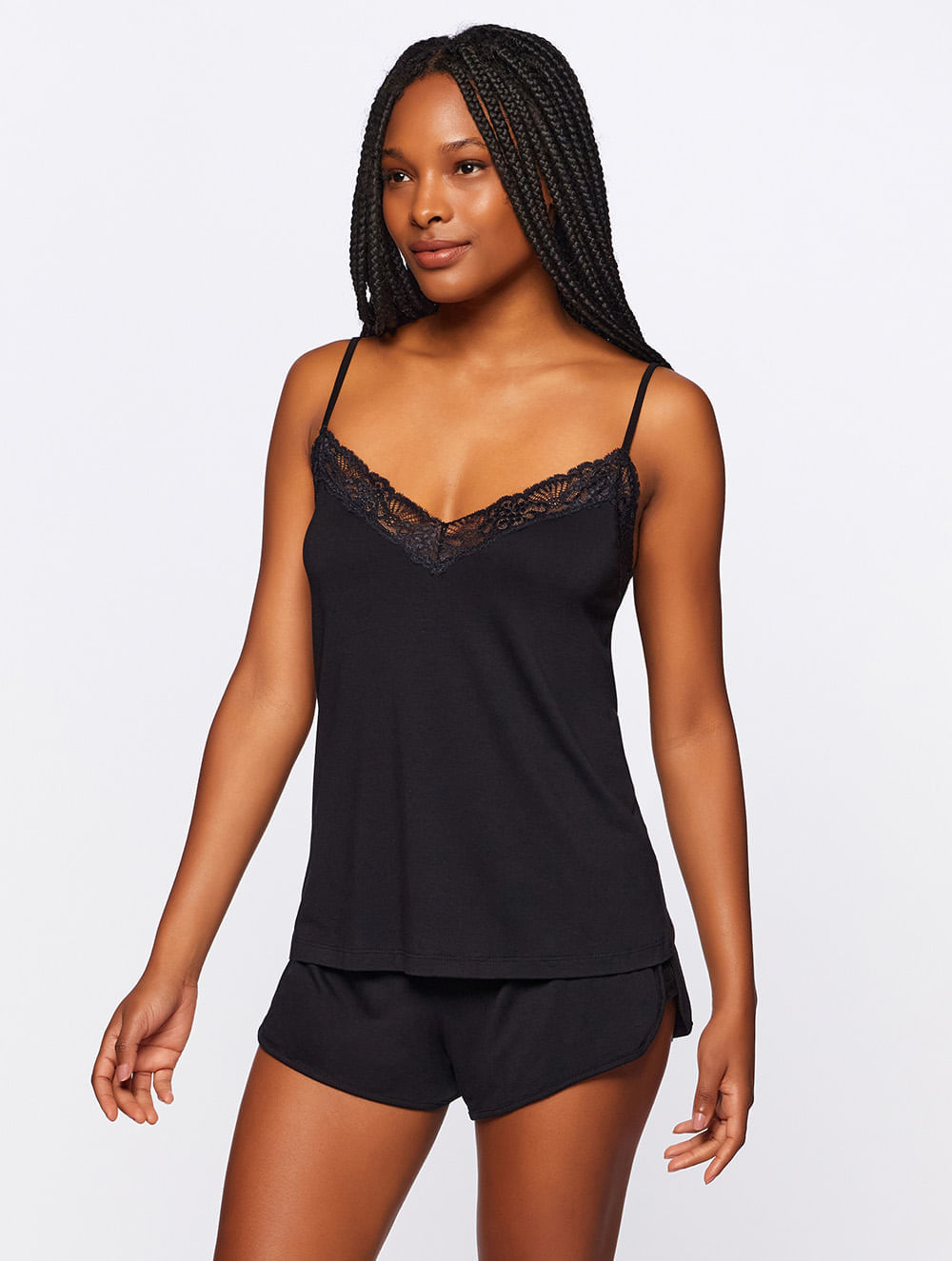 Shortdoll confeccionado em malha de viscose com blusa de alcinha com regulagens e aplicação de renda no decote. Shorts com elástico no cós e detalhe do recorte em laise nas laterais.