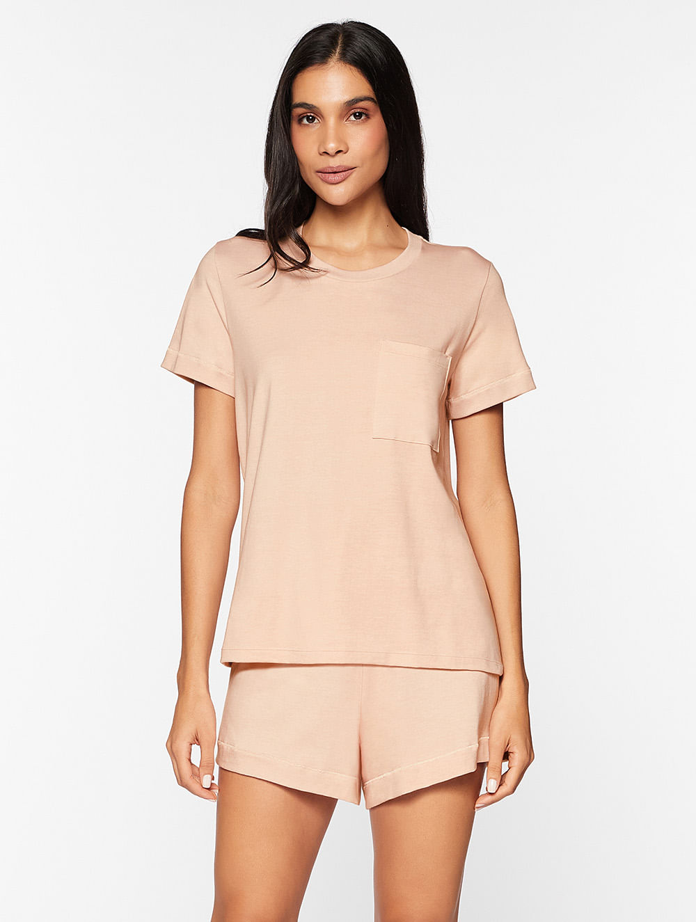 Short doll confeccionado em malha pima que proporciona excepcional conforto e durabilidade. Com mangas curtas, detalhe em ribana na gola e um discreto bolso frontal, torna-se uma peça versátil. Short possui cós com elástico embutido e modelagem soltinha