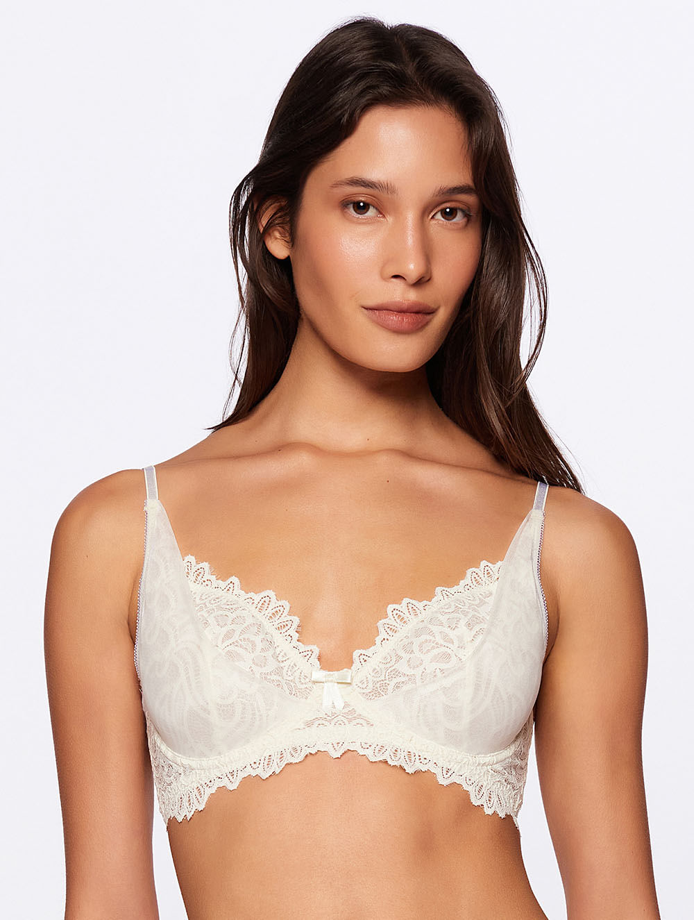 Sutiã leve com aro e sem bojo, em renda com detalhe de tule sobreposto no busto, alças com regulagem e fecho nas costas.