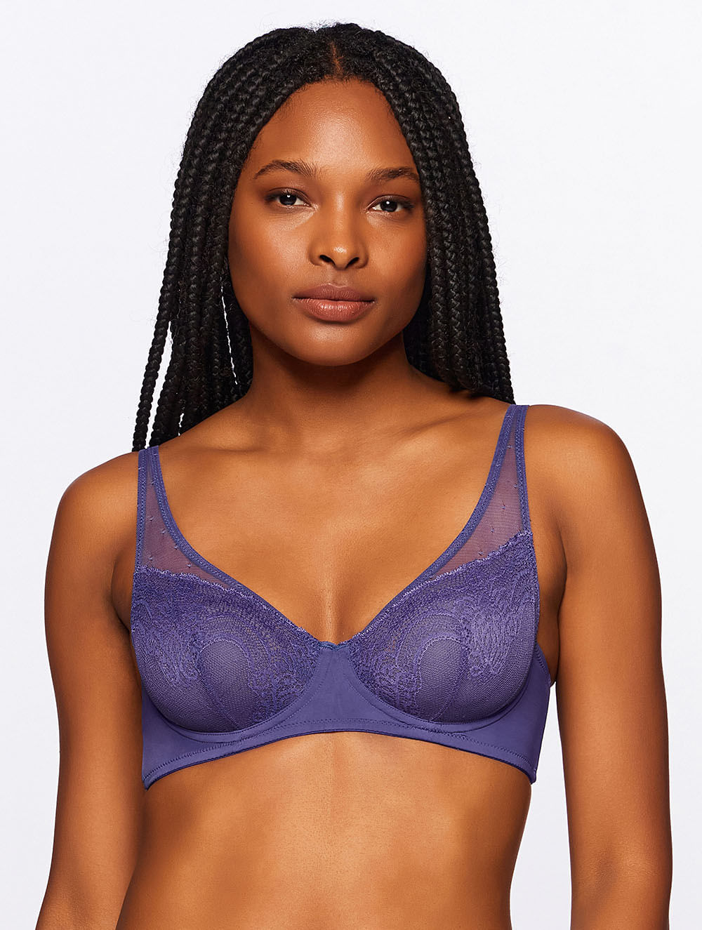 Sutiã sem bojo, com aro, transparência no busto e base em microfibra. Possui alças mais largas em laise com regulagem e fecho nas costas.