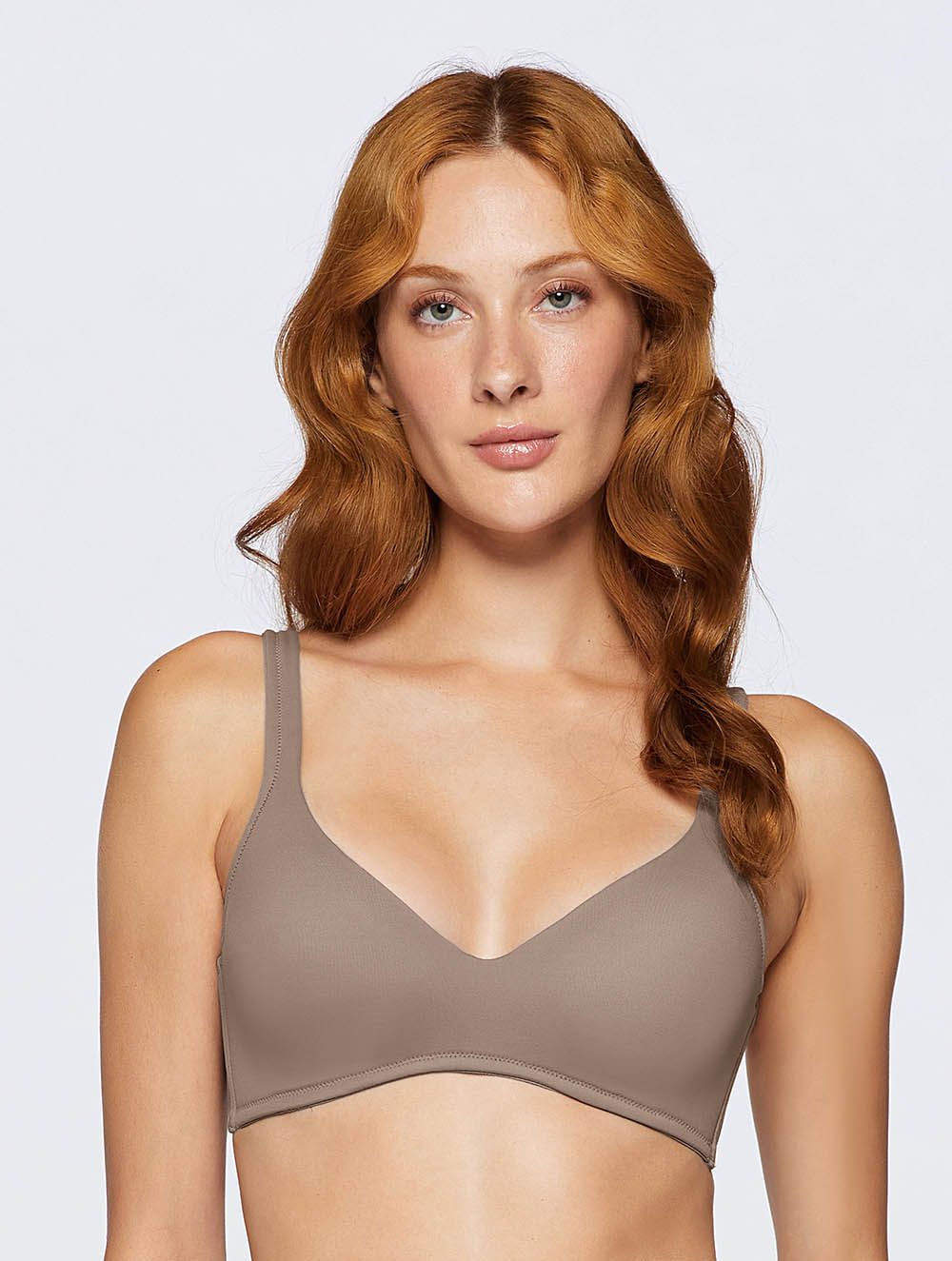 Sutiã com bojo de formato natural que valoriza o decote. O modelo possui base reforçada com manta que confere sustentação dispensando o aro, laterais em microfibra dupla, alças mais largas com regulagem e fecho nas costas.