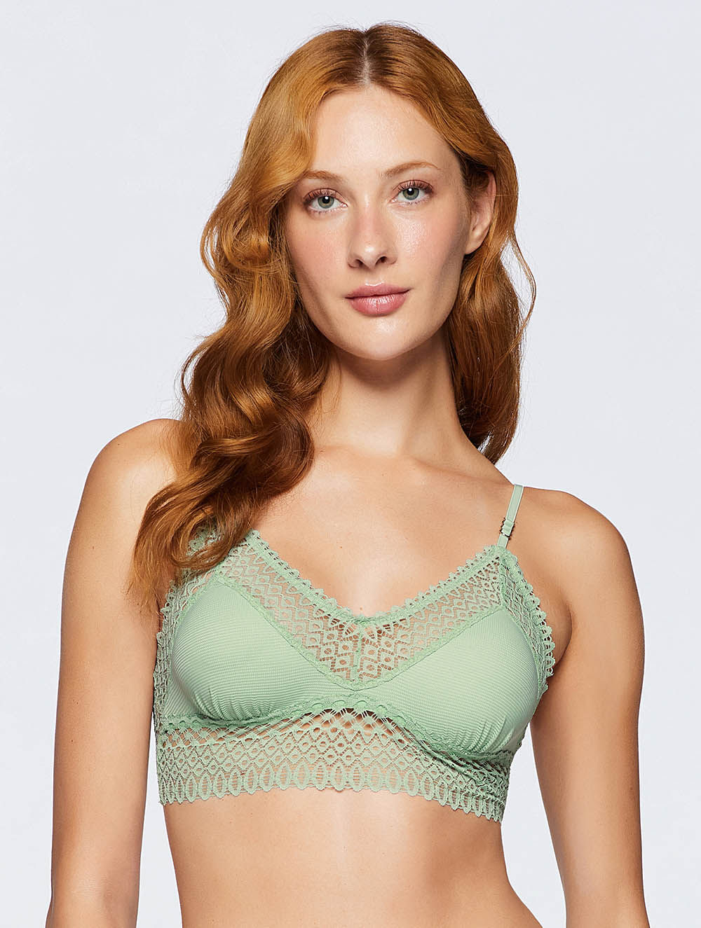 Sutiã leve sem bojo e sem aro, em laise com forro no busto, contornado pelo bico de renda. O modelo possui modelagem mais alta e laterais mais largas, com alças reguláveis e fecho nas costas.