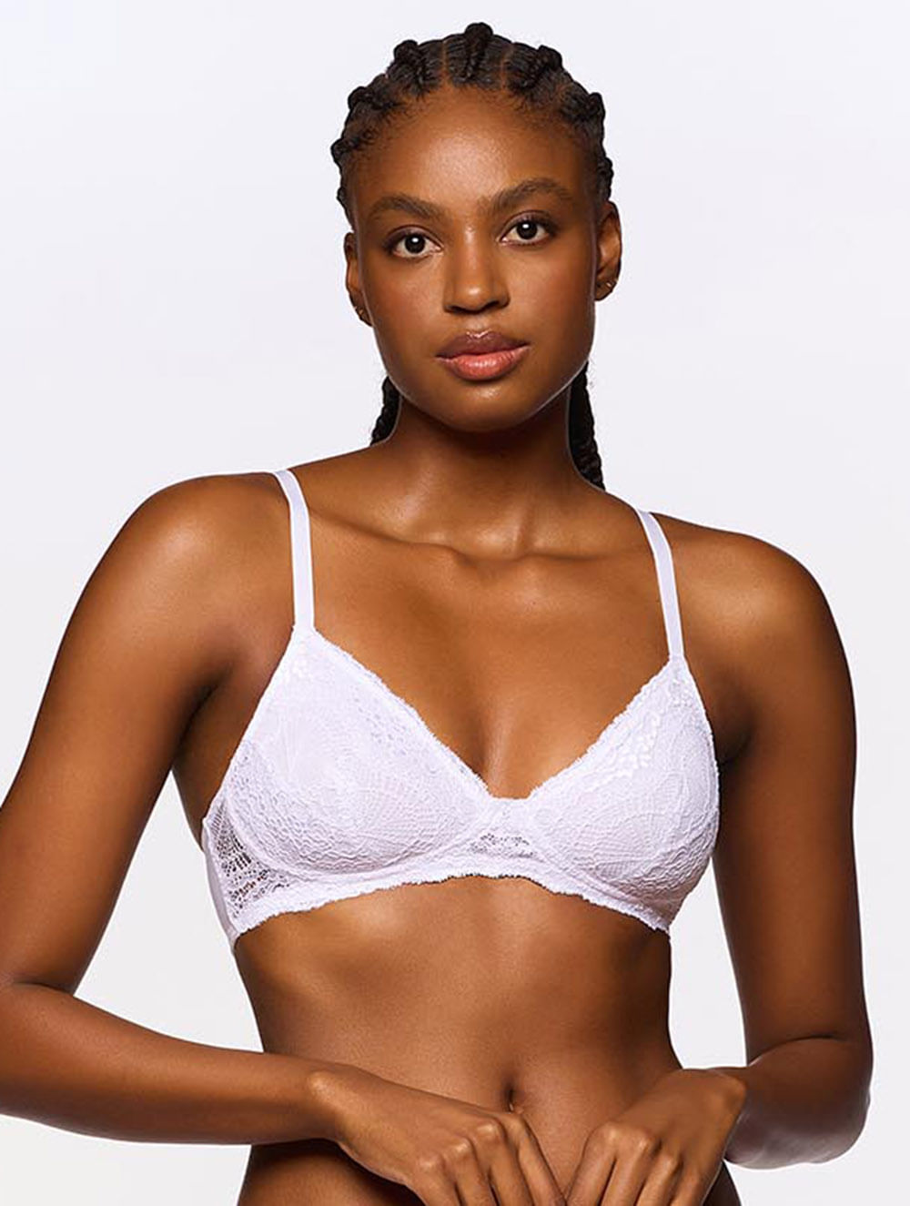 Sutiã em renda e microfibra sem aro e sem bojo. Possui recorte abaixo de busto que ajuda a desenhar a sustentar. Costas em U com alça de elástico com regulagem.