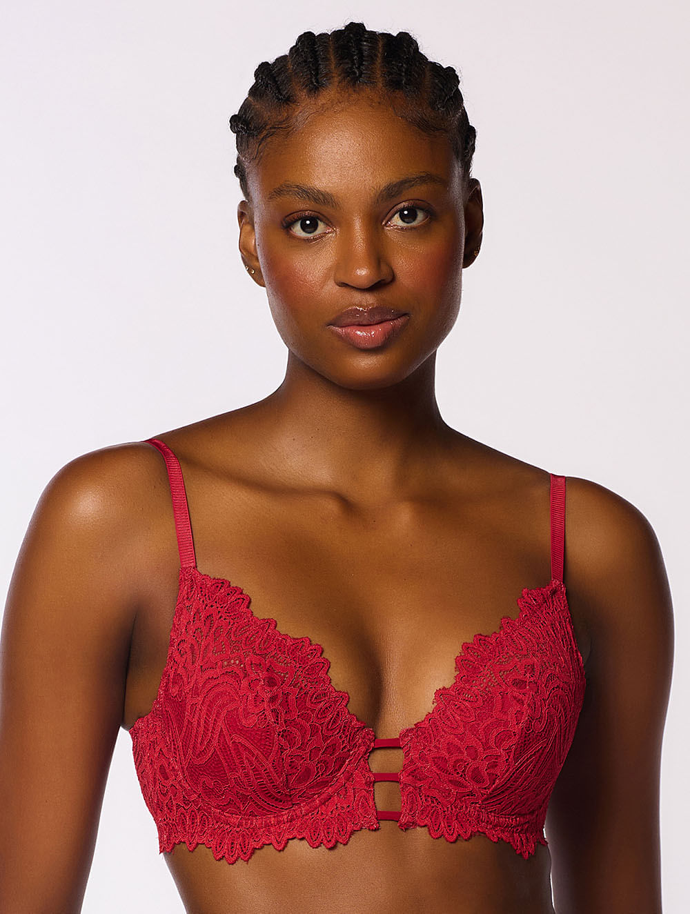Sutiã com manta no busto e aro, é confeccionado em renda exclusiva. A peça possui detalhes no centro do busto, alças elásticas reguláveis, laterais mais largas com barbatana para maior sustentação e fecho nas costas.