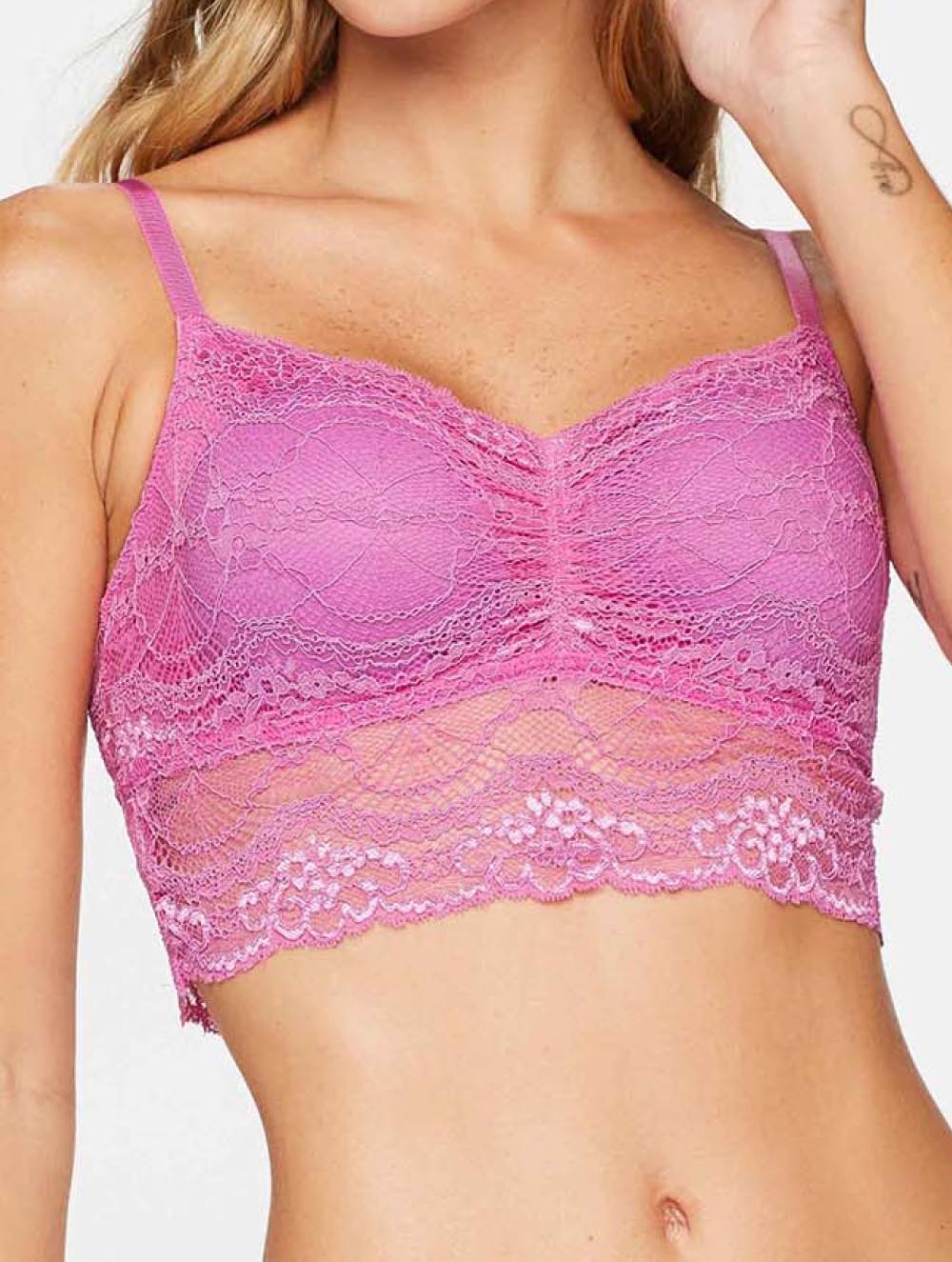 Top em renda com forro de microfibra e bojo removível. Possui base mais alongada e alças elásticas com regulagem. Não possui fecho nas costas.