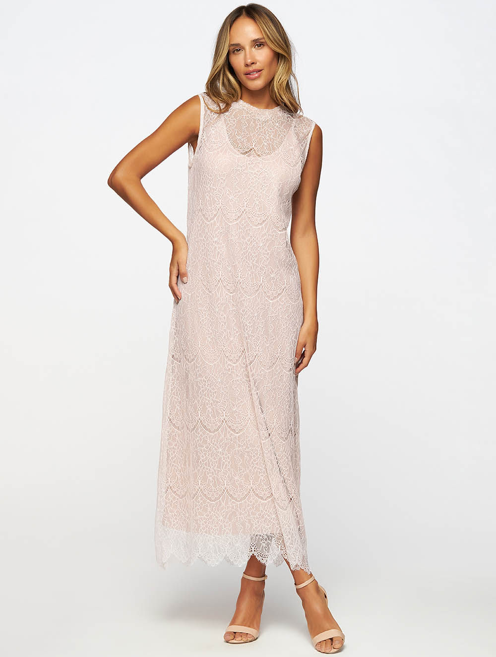 Vestido midi confeccionado em laise. Barra possui detalhe de bico de renda delicado. Fechamento por gota e botão no centro decote costas. Anágua confeccionada em linho com regulagem de alças acompanha a peça.